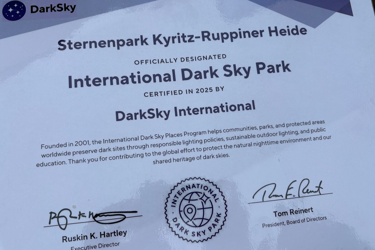 Für die Kyritz-Ruppiner Heide und den Landkreis Ostprignitz-Ruppin ist das ein besonderer Augenblick, man kann auch sagen Meilenstein: Die Organisation DarkSky International (DSI) hat den ehemaligen Truppenübungsplatz, der auch Teil des Naturparks Kyritz-Ruppiner Land ist, als Internationalen Sternenpark offiziell ausgewiesen. Und das nicht ohne Grund, denn schließlich zählt die Heide zu den dunkelsten Orten Deutschlands und eignet sich deshalb besonders gut zum Bewundern der Sterne. Dies dauerhaft zum Schutz der Nacht zu erhalten, ist das Ziel der regionalen Akteure. Mit der Ausweisung als Sternenpark wurde ein wichtiger Schritt dafür getan.