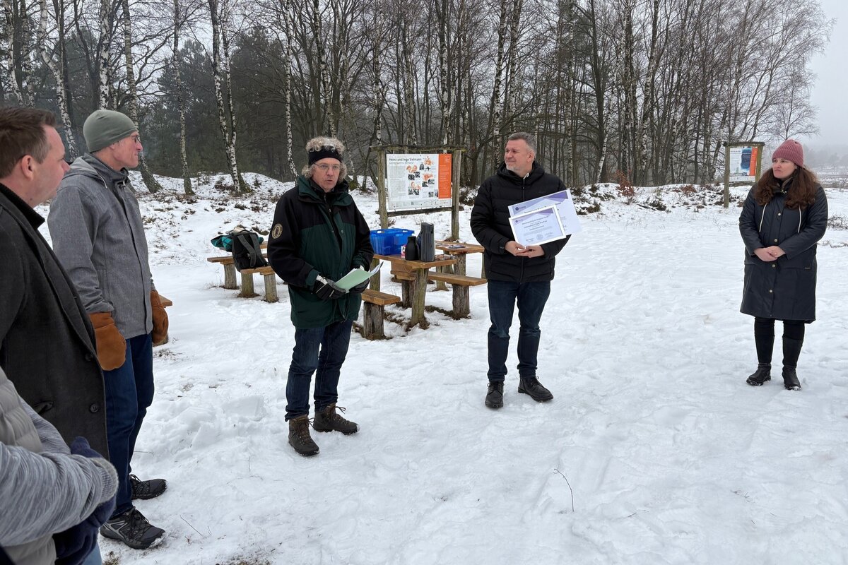 Landrat Ralf Reinhardt präsentierte bei einem kleinen Festakt gemeinsam mit Gästen am Fuße des Heideturms auf dem Sielmann-Hügel, dem Wahrzeichen der Kyritz-Ruppiner Heide, nicht ohne Stolz die von der DSI ausgestellte Zertifizierungsurkunde. Dabei bezeichnete er die Anerkennung der Kyritz-Ruppiner Heide als offizieller Sternenpark einen großartigem Erfolg, zu dem er allen, die am Zustandekommen beteiligt waren, herzlich gratulieren dürfe. "Die Heide im Herzen unseres Landkreises ist nicht nur ein Ort mit einer einzigartigen Tier- und Pflanzenwelt; der hier besonders dunkle Nachthimmel ermöglicht es darüber hinaus, die faszinierende Welt der Himmelsbeobachtung erlebbar zu machen, etwa im Rahmen von Sternenführungen. Mein besonderer Dank gilt dem Naturpark Stechlin-Ruppiner Land sowie den Mitgliedern der KAG Kyritz-Ruppiner Heide für deren engagierte und konstruktive Beteiligung beim Antragsprozess. Der künftige Sternenpark in der Kyritz-Ruppiner Heide wird ein Alleinstellungsmerkmal in unserer Heimatregion sein, welches auch neue Perspektiven im touristischen Bereich öffnet, die es in den kommenden Jahren weiter zu entwickeln gilt", so der Landrat.