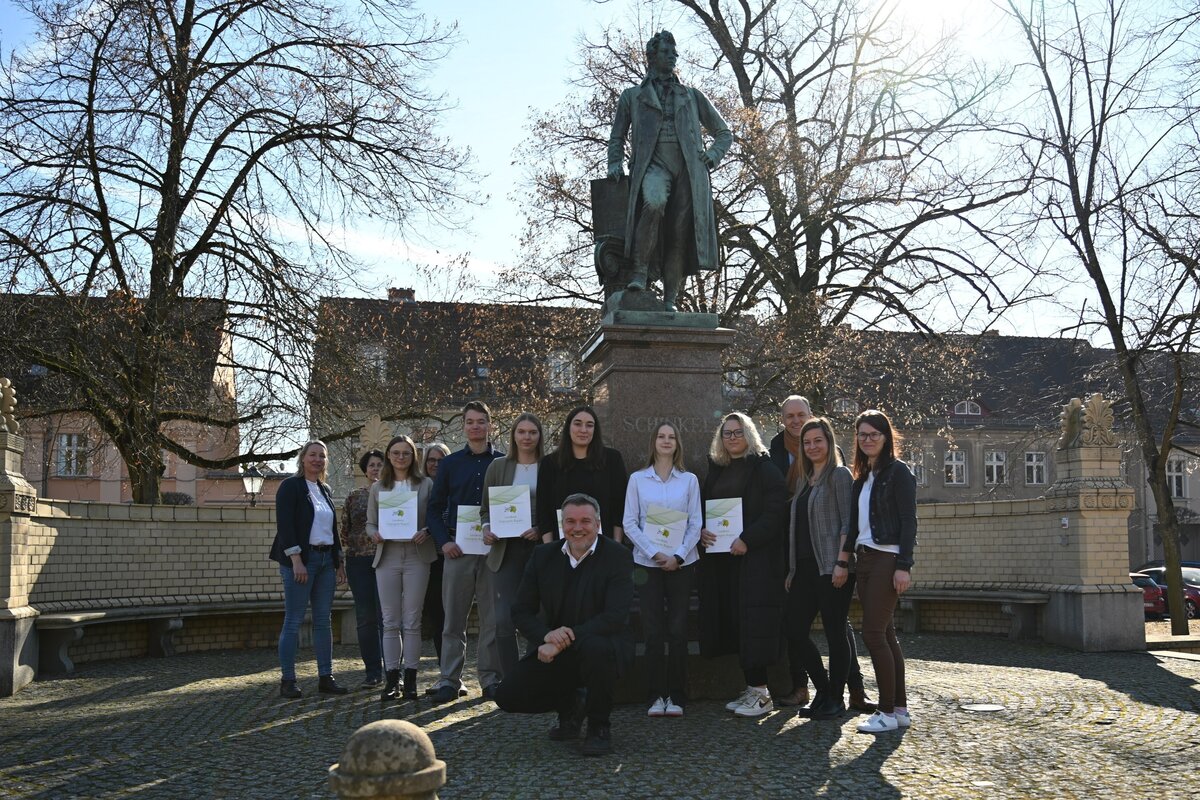 Natürlich durfte am Ende auch das traditionelle Gruppenfoto mit den "Neuen" nicht fehlen, diesmal wieder am Schinkel-Denkmal auf dem Kirchplatz, also in unmittelbarer Nähe der Kreisverwaltung. Der spätere königliche Architekt und Stadtplaner Karl Friedrich Schinkel war am 3. März 1781 in Neuruppin geboren worden. Sein Elternhaus stand einst an der Stelle des heutigen Denkmals.