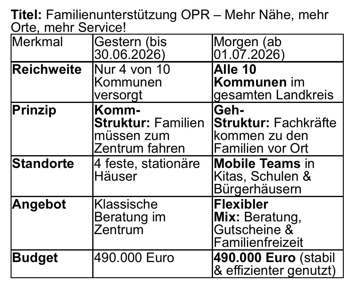 Der Jugendhilfeausschuss des Landkreises OPR hat eine wegweisende Entscheidung für die Zukunft der regionalen Familienhilfe getroffen und die neue Konzeption "Familienunterstützende Angebote" beschlossen. Ab dem 1. Juli 2026 wird das bisherige System grundlegend modernisiert, um künftig Familien in allen zehn Kommunen des Landkreises gleichermaßen zu erreichen.