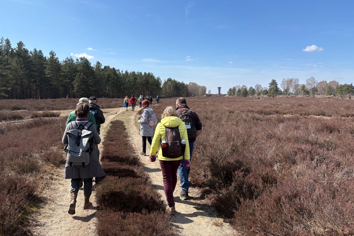 Der Landrat schloss sich dabei der illustren Wandergruppe um Natur- und Landschaftsführer Günter Lutz aus Wittstock/Dosse an, die vom Parkplatz Neuglienicke aus startete. Auf der etwa sieben Kilometer langen Strecke ging es auf ausgeschilderten Naturwegen durch die Heidelandschaft, die teilweise noch die verkohlten Spuren des letzten Heidebrandes aufwies. Bei diesen in den kühleren Monaten kontrolliert durchgeführten Bränden wird, so erläuterte es Günter Lutz seinen interessiert zuhörenden Gästen bei einer der kurzen Pausen, die Heide jung gehalten. Überalterte und stark verholzte Heidesträucher brennen nieder und das Keimen junger Heidepflanzen wird mit dieser feuerökologischen Pflegemaßnahme gefördert.