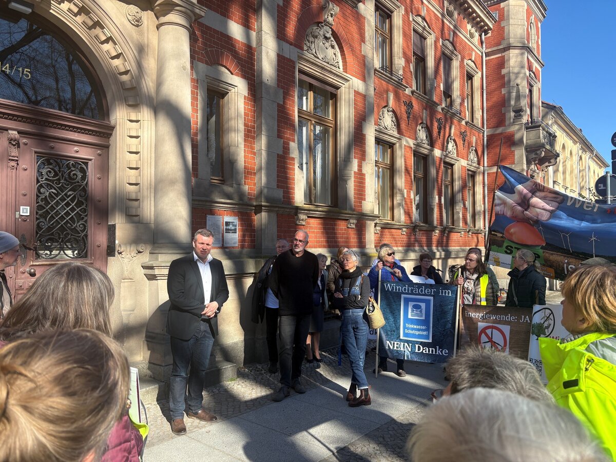 Vor der Kreisverwaltung in Neuruppin haben vergangene Woche Vertreter:innen verschiedener Bürgerinitiativen für die Anerkennung bestehender Windkraftanlagen bei der Festlegung neuer Windvorranggebiete demonstriert. Landrat Ralf Reinhardt warnte in einer Diskussion mit den Demonstrierenden vor einem drohenden ungezügelten Bau von Windkraftanlagen in der Region.