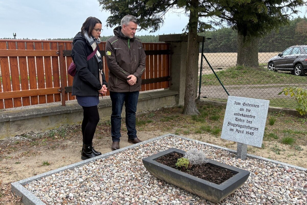 "Was nun die Ursachen für das Absturzgeschehen vor 81 Jahren waren, welche Zusammenhänge es gab und wohin die Passagiere des Flugzeugs tatsächlich wollten, das wird schwer zu klären sein. Uns geht es aber darum, die Toten nicht zu vergessen", erklärt Landrat Ralf Reinhardt bei einem Besuch des Friedhofs von Trieplatz.